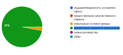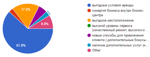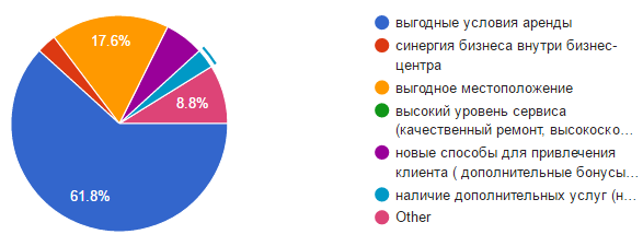Конкуренция цены выходит на первый план: более половины опрошенных арендотадателей ориентируются на привлечение новых клиентов за счет предложения «выгодных условий аренды», менее 20% считают, что выгодное местоположение также привлекает арендаторов. Но никто из опрошенных не считает, что высокий уровень сервиса – является ключевым показателем при выборе их офисных помещений.