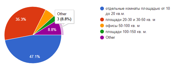 Оценивая существующий спрос, большая часть опрошенных (47,1%) склоняется к потребности в помещениях до 20 кв.м, треть - до 50 кв.м.