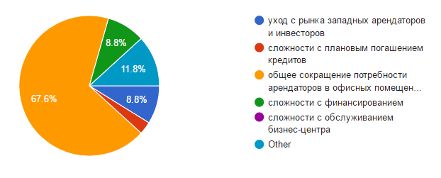 И в заключение, хотелось бы обратить внимание, что около 70% арендодателей столкнулись в 2015 году с трудностями, при этом основной причиной считают «общее сокращение потребности арендаторов в офисных помещениях». Возможно, это общие тенденции рынка, а возможно и внутренняя политика «офисных центров» сыграла роль в наличии данного фактора.